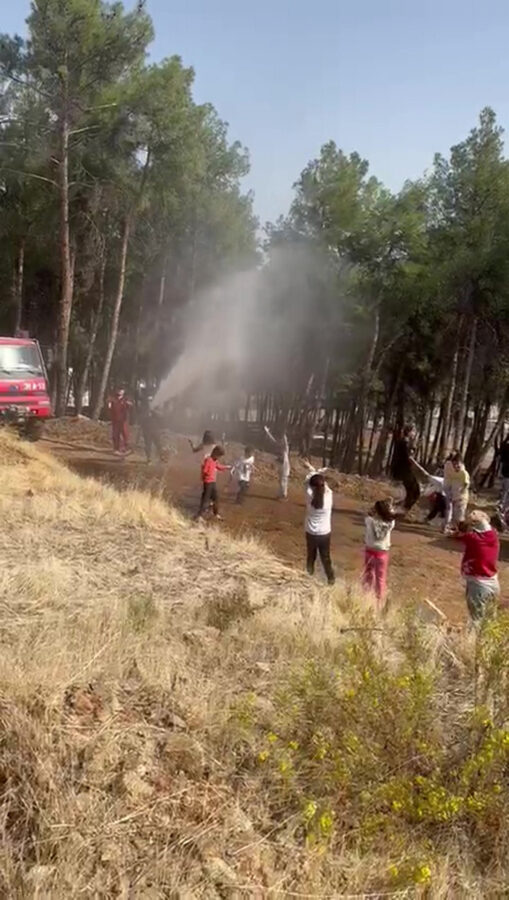 Hatay’ın Kırıkhan ilçesinde fidan dikimine katılan depremzede çocukların yüzü arazözden havaya fışkırtılan suyla eğlenerek güldü.