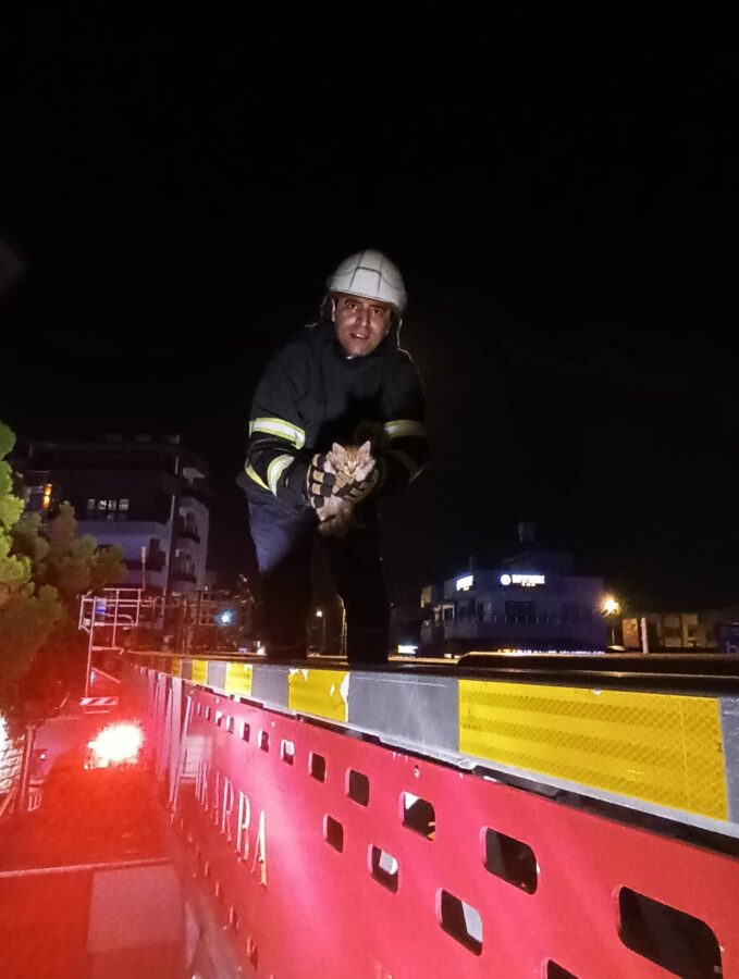 Karaağaç Övündük mahallesinde bir ağaçtan kedi sesi geldiğini fark edenler durumu itfaiye ekiplerine bidirdi.