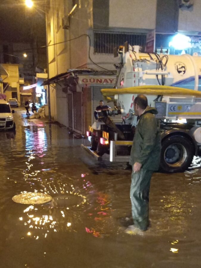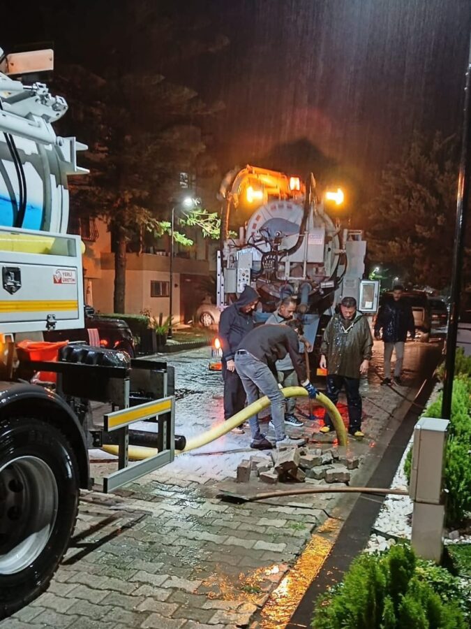 Gece saatlerinde başlayan ve etkisini artıran yağışların ardından ekipler; atık su ve yağmur suyu deşarj hatlarında oluşan arızalara müdahale ederek su birikintilerini giderdi.