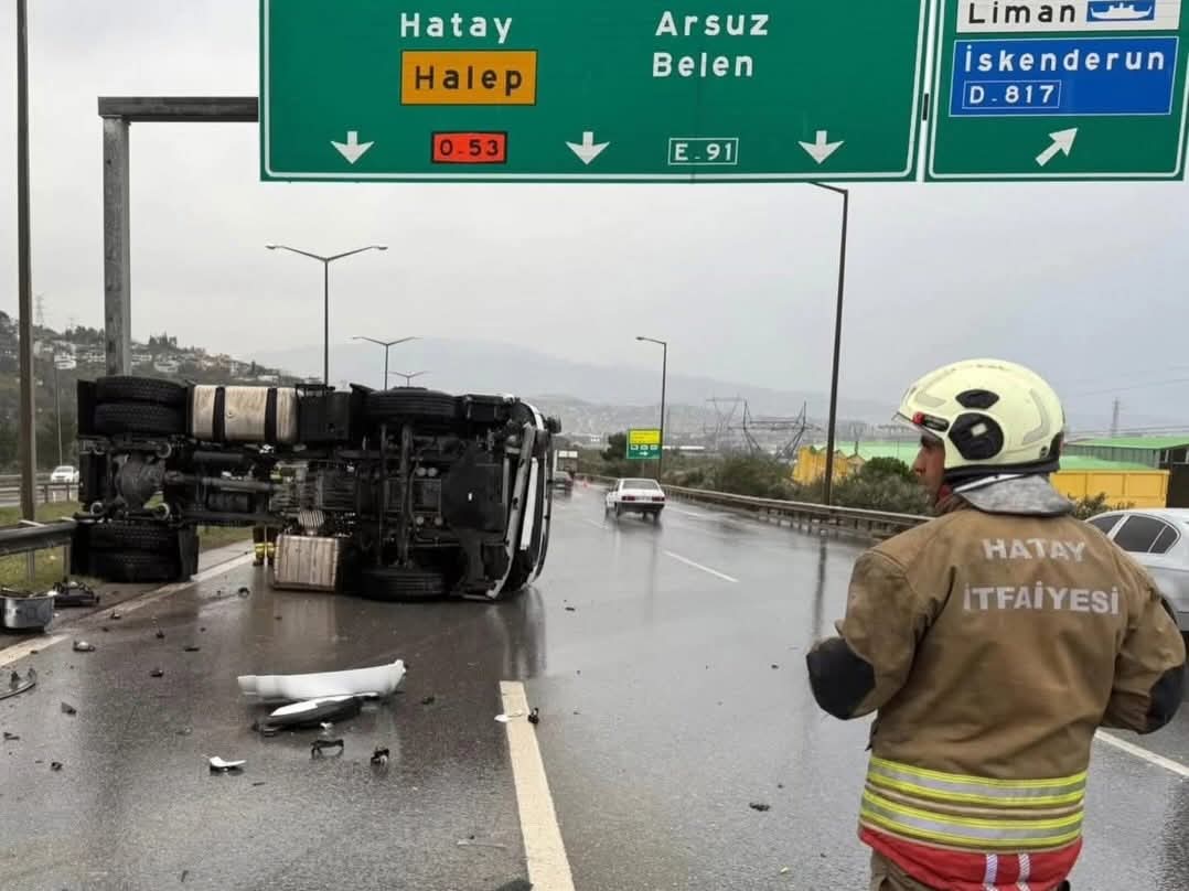 Hatay’ın İskenderun ilçesinde, devrilen tırın sürücüsü yaralandı.