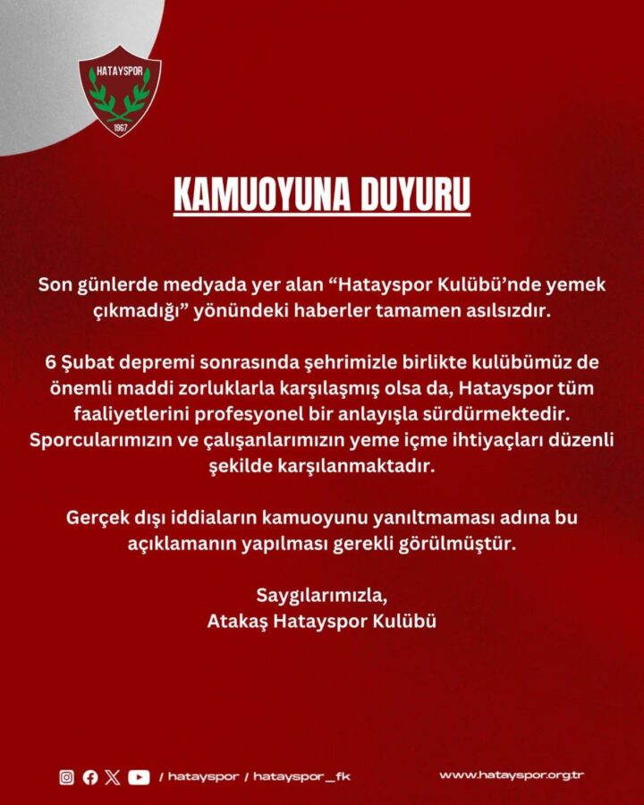 “Son günlerde medyada yer alan ‘Hatayspor Kulübünde yemek çıkmadığı’ yönündeki haberler tamamen asılsızdır. 6 Şubat depremi sonrasında şehrimizle birlikte kulübümüz de önemli maddi zorluklarla karşılaşmış olsa da Hatayspor tüm faaliyetlerini profesyonel bir anlayışla sürdürmektedir. Sporcularımızın ve çalışanlarımızın yeme içme ihtiyaçları düzenli şekilde karşılanmaktadır. Gerçek dışı iddiaların kamuoyunu yanıltmaması adına bu açıklamanın yapılması gerekli görülmüştür.”