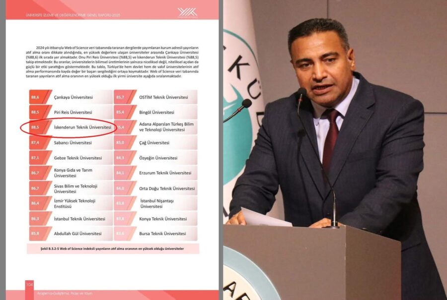 Türkiye genelinde üniversitelerin eğitim-öğretim, araştırma-geliştirme, uluslararasılaşma, sürdürülebilirlik ve topluma hizmet başlıklarında 67 gösterge doğrultusunda değerlendirildiği raporda, İskenderun Teknik Üniversitesi önemli bir başarı elde etti. Rapora göre, Web of Science veri tabanında taranan dergilerde yayımlanan kurum adresli yayınların atıf alma oranı dikkate alındığında, İskenderun Teknik Üniversitesi %88,5’lik oranla Türkiye genelinde üçüncü sırada yer aldı. Bu alanda Çankaya Üniversitesi (%88,6) ilk sırada yer alırken, Piri Reis Üniversitesi (%88,5) ikinci sırada bulundu. İskenderun Teknik Üniversitesi, bu yüksek oranla hem devlet hem de vakıf üniversiteleri arasında öne çıkan üniversitelerden biri oldu.