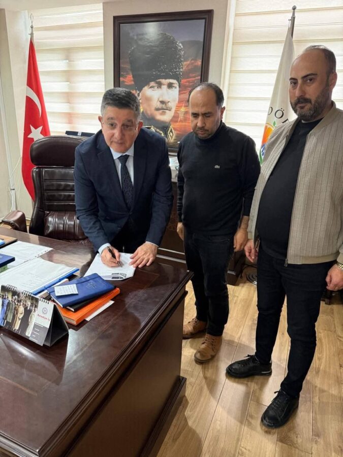 Dörtyol Belediyesi Başkanlık Makam Odasında Belediye Başkanı Dr. Bahadır Amaç ile Dörtyol Ziraat Odası Başkanı Mevlüt Coşkun, Meyve Suyu Fabrikası için ortak protokol imzaladı.