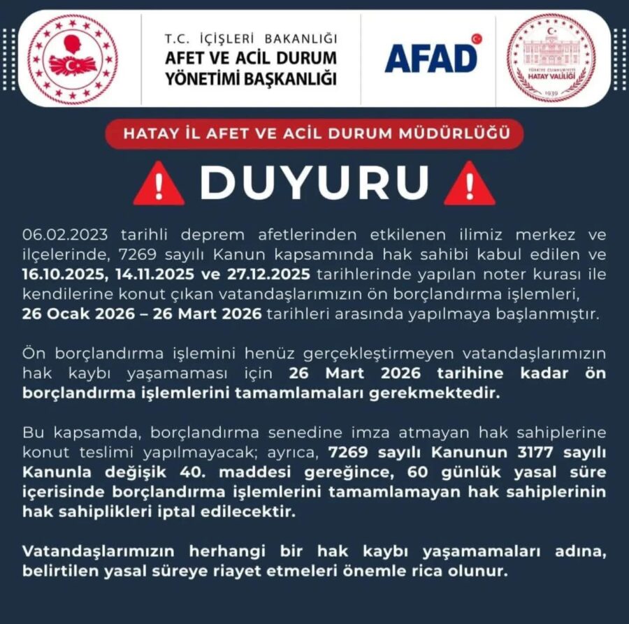 AFAD, ön borçlandırma işlemini henüz tamamlamayan hak sahiplerinin 26 Mart 2026 tarihine kadar işlemlerini tamamlamaları gerektiğini vurgulayarak, aksi halde hak kaybı yaşanabileceği uyarısında bulundu.