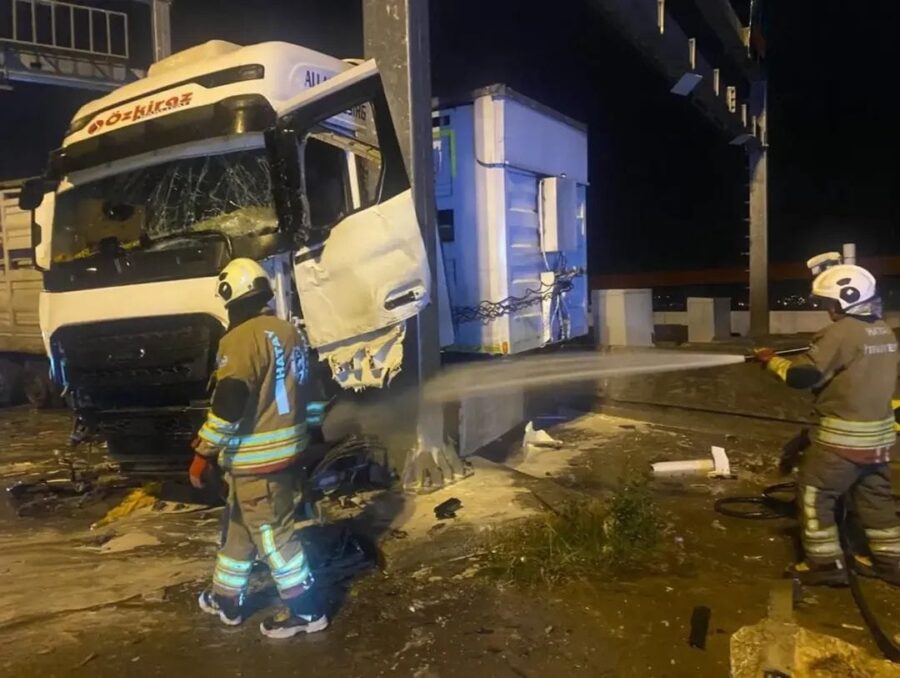 Gece saatlerinde bir tır gişelere çarparak alev aldı.