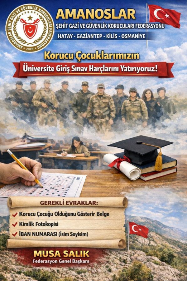 Amanoslar Güvenlik Korucuları Federasyonu Genel Başkanı Musa Salık, geleceğin teminatı olan gençlere yönelik anlamlı bir destek programını kamuoyuyla paylaştı. Salık’ın öncülüğünde federasyon, üniversite sınavına girecek korucu çocuklarının sınav giriş harçlarını karşılama kararı aldı.