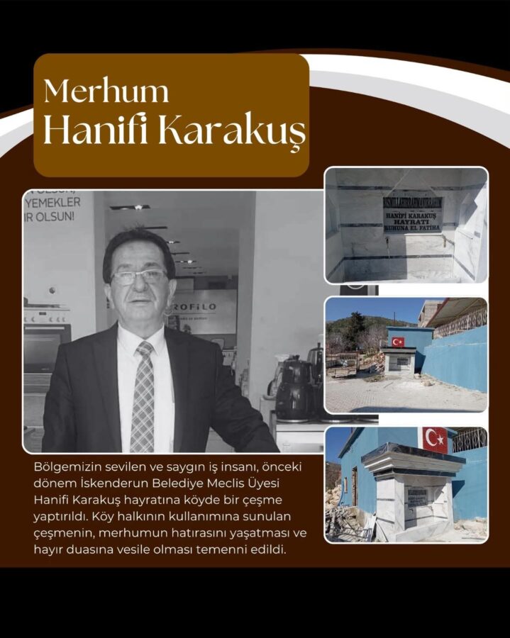 Yaşamında hayırsever ve çalışkan bir insan olan merhum Hanifi Karakuş’un ailesi Babalarının hayır kapısının kapanmaması için çok hayırlı bir işe imza attılar. Merhum Hanifi Karakuş’un memleketi Hatay’ın Yayladağı ilçesi Yeditepe (Bezge) Mahallesinde Mezarlık önünde bulunan ve ‘Hanifi Karakuş Hayratı’ olarak adının verildiği çeşmenin bakım, onarımı ailesi tarafından titiz bir çalışma ile yaptırıldı. Karakuş ailesi örnek bir hayır işinde bulunarak, tadilatının yanı sıra çeşmeyi mermerle kaplattılar ve hayırlı bir Sadaka-i Cariye olarak halkın en önemli su ihtiyacını karşıladılar. Vatandaşlar, Merhum Hanifi Karakuş’un ailesine yaptıkları hayırlarından dolayı teşekkür ettiler ve merhum Hanifi karakuş’un ruhuna Fatihalar okudular.