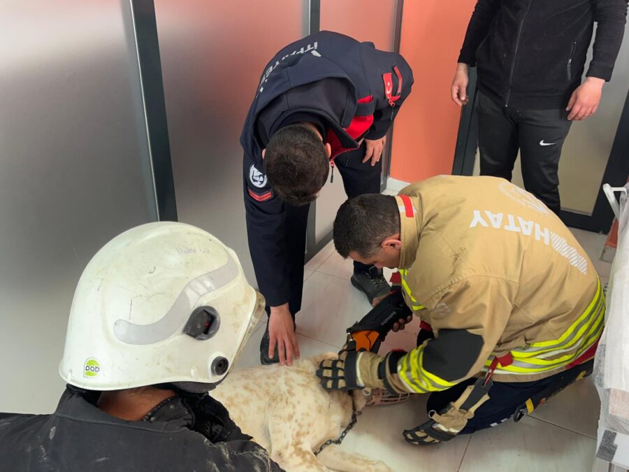 Hatay Büyükşehir Belediyesi İtfaiye Daire Başkanlığı ekipleri, Defne ilçesi Çekmece Mahallesi’nde boynuna sıkışan demir zincir nedeniyle yaralanan bir köpeğin imdadına yetişti.